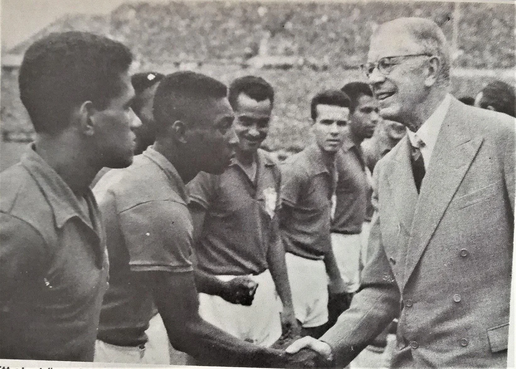 Kung Gustaf VI Adolf hälsar på Pelé inför finalen